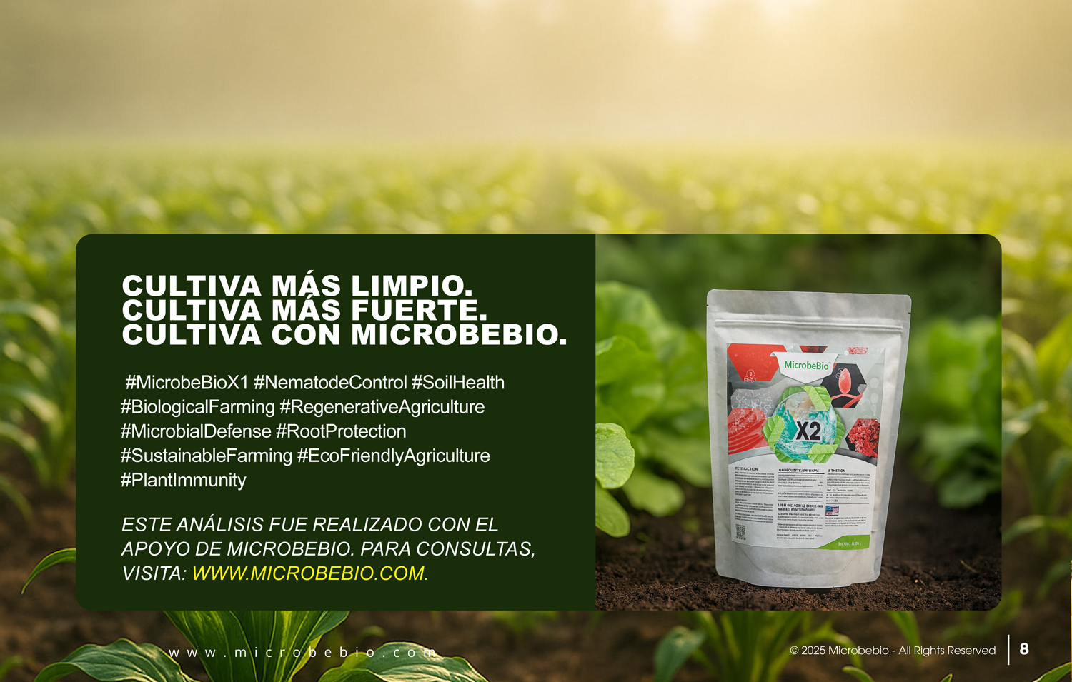 MicrobeBio X2™ muestra su máximo rendimiento cuando se aplica durante períodos de menor intensidad de luz solar. Preferiblemente, administra el tratamiento por la mañana o al final de la tarde para evitar la exposición directa al sol, lo que podría comprometer la eficacia de los microorganismos activos.